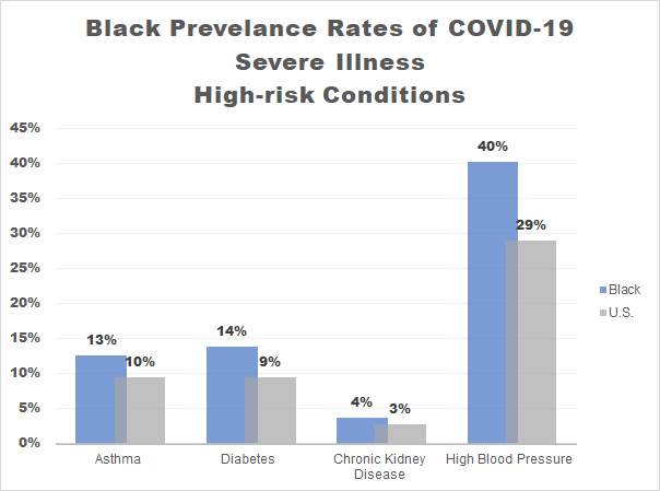 In the release, black people accounted for about 33 percent of COVID-19 hospitalizations in the U.S., although we make up about 13 percent of the U.S. population. Public health officials are attributing these numbers in part to health disparities of the black community, which leads to the fact that black people suffer from many of the conditions that place people at risk of severe illness from COVID-19. The underlying medical conditions include chronic lung disease, high blood pressure, diabetes, chronic kidney disease, and people with liver disease. Below is a chart of some of these conditions in the black community compared to the general population.
